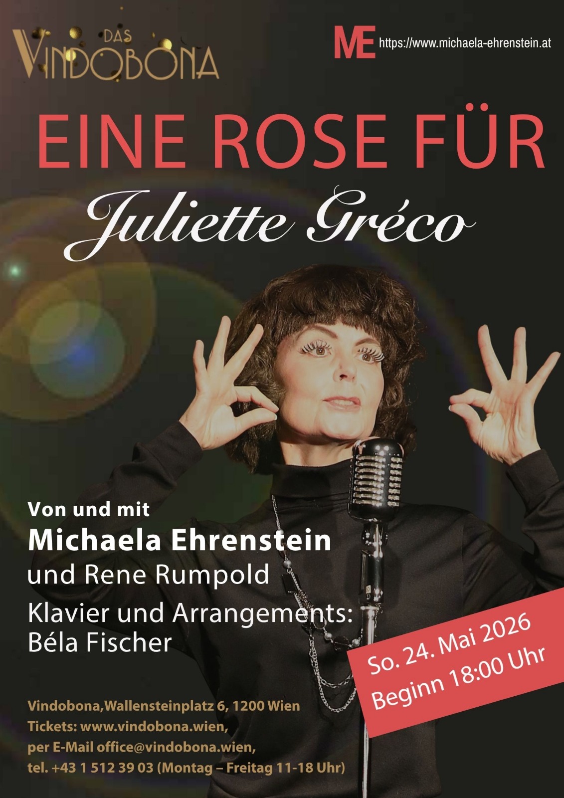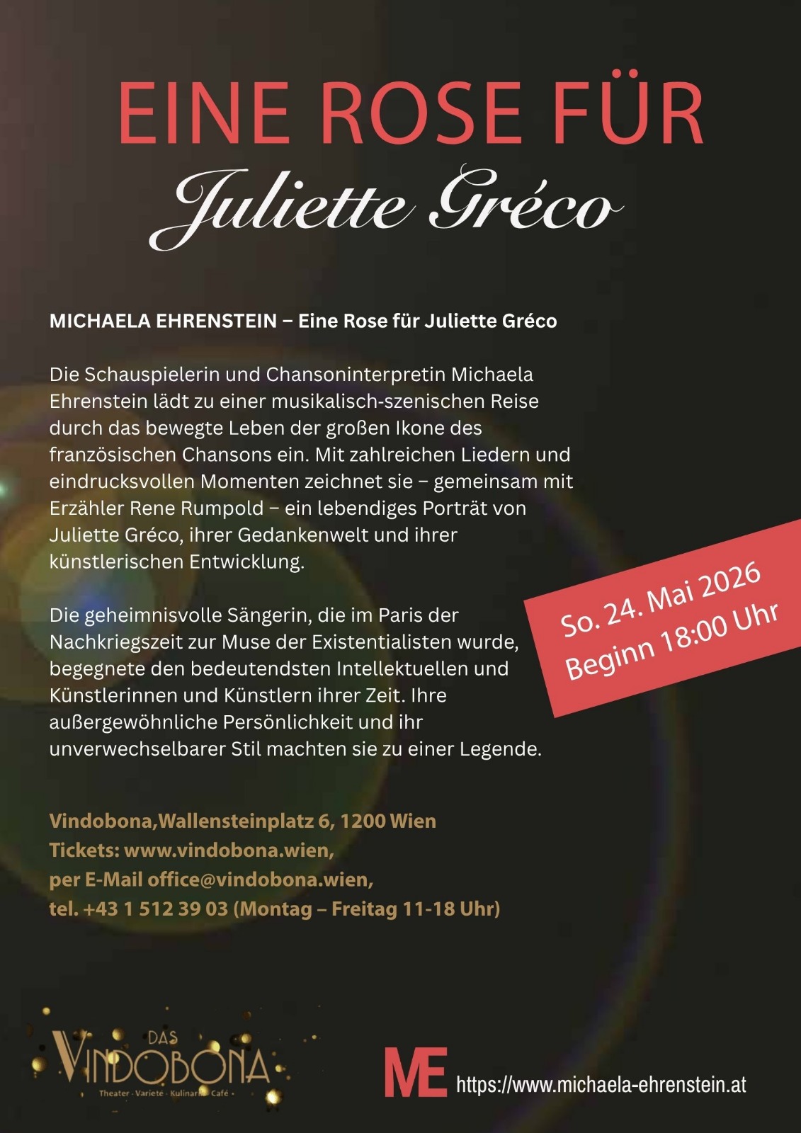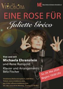 Wir freuen uns, Sie liebes Publikum davon in Kenntnis zu setzen, dass unser Werk EINE ROSE FÜR JULIETTE GRECÓ nun den Aufführungsort DAS VINDOBONA gewählt hat. „Wir“ sind Michaela Ehrenstein (Grecó und Mitautorin), René Rumpold (Autor, VIELE Rollen und Erzähler) und am Klavier begleitet uns wieder Bela Fischer sen.
