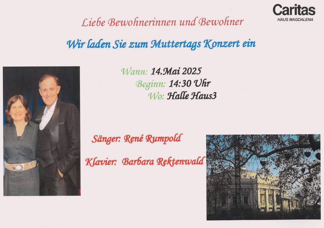 Wie seit mittlerweile 12 Jahren singt René Rumpold (noch immer) in der Seniorenresidenz Hülgerthpark ein Muttertagskonzert, begleitet von Barbara Rektenwald am Klavier. Seine Mutter hatte dort ihren Lebensabend verbracht.