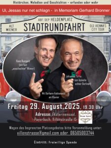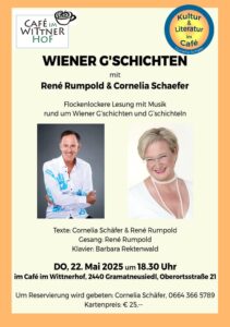Nach Jahren der „Abstinenz“ treten die beiden Künstler wieder miteinander auf. Diesmal mit einer Lesung um Wien – WIENER G’SCHICHTEN eben. Und René Rumpold wird unter Begleitung von Barbara Rektenwald auch ein paar Wiener Lieder zum Besten geben.