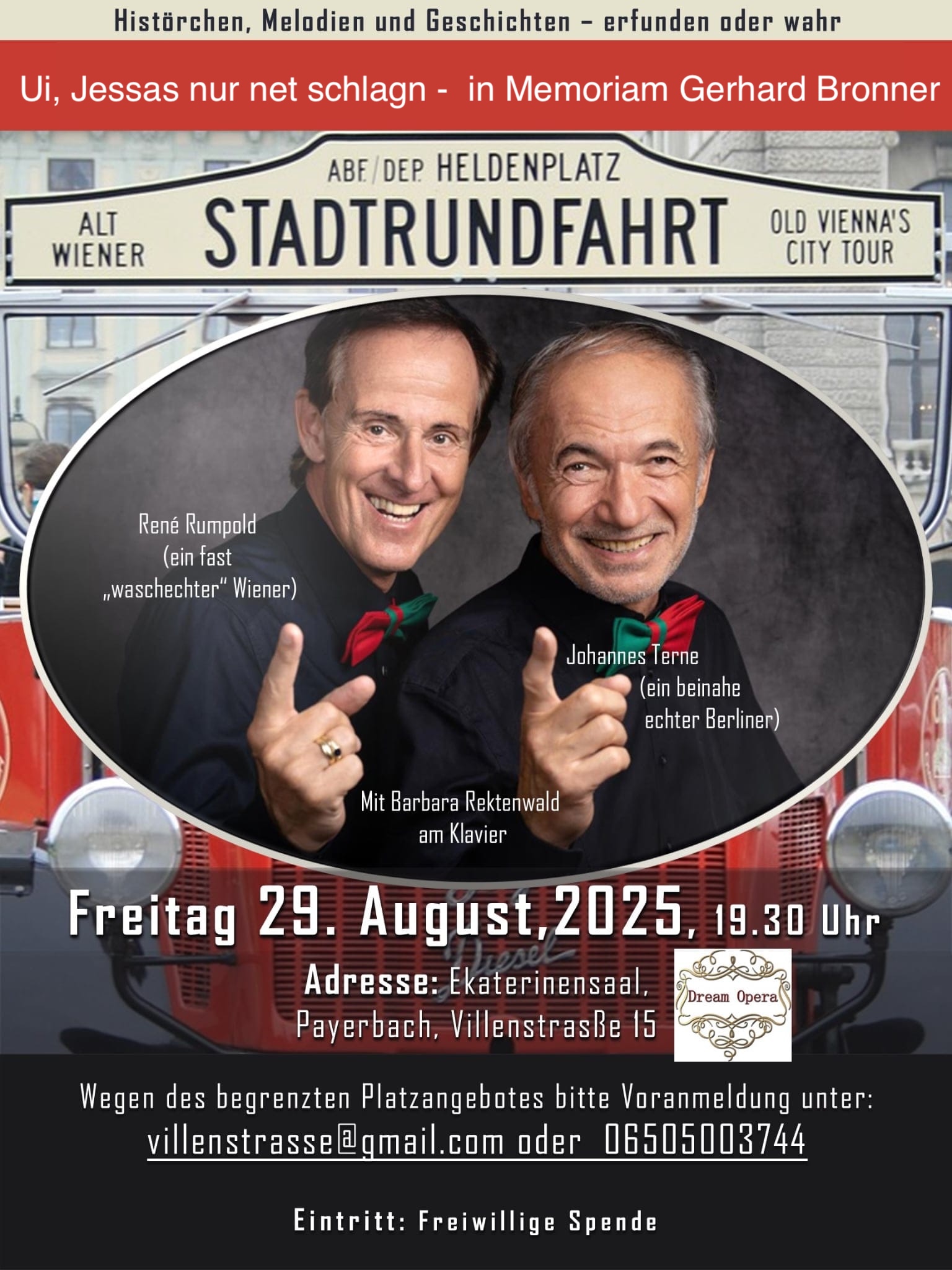 Erleben Sie wieder RENÉ RUMPOLD und Barbara Rektenwald am Klavier – diesmal mit einer besonderen, musikalischen Erinnerung an den berühmten Kabarettisten GERHARD BRONNER, welcher zugleich auch ein enger Freund von Rumpold war.