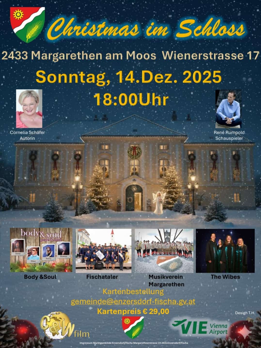 Erleben Sie nun dieses Jahr bereits zum zweiten Mal Cornelia Schäfer und René Rumpold diesmal mit weihnachtlichen Erzählungen unter dem Titel „Christmas im Schloss“ mit diversen anderen Künstler:innen und all dies im „Veranstaltungsschloss Margarethen“.
